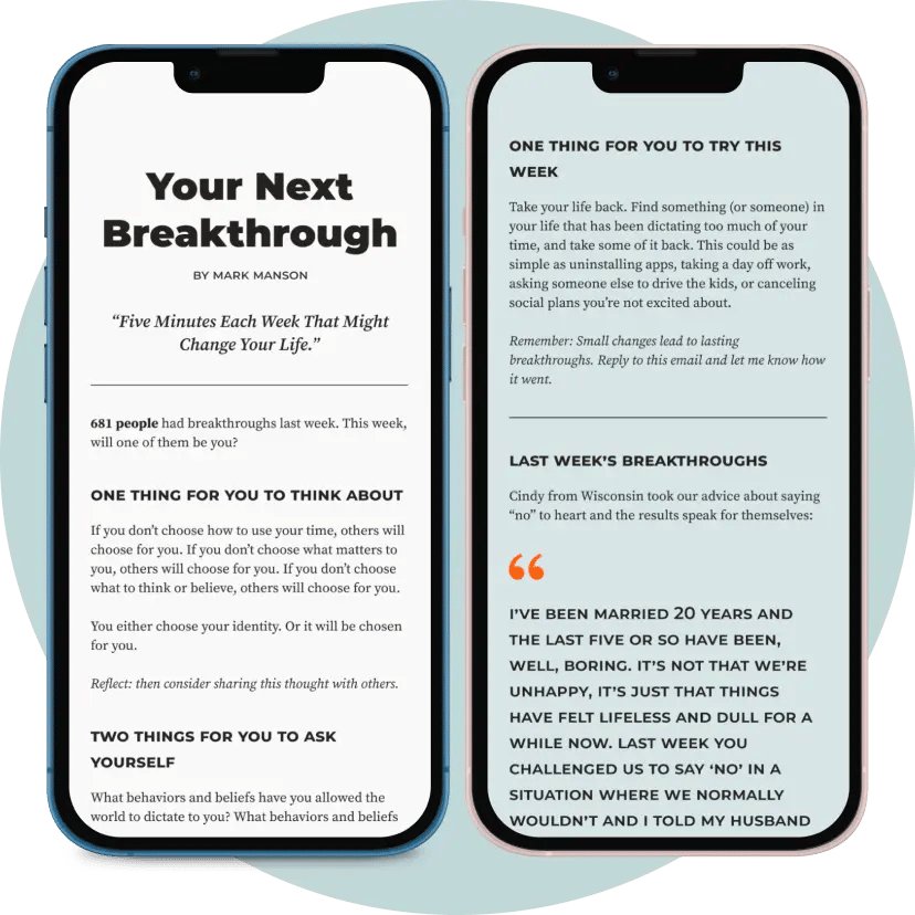 Join Mark Mansonβs weekly newsletter β Your Next Breakthrough β to receive one idea, one question, and one exercise designed to spark your next breakthrough. No fluff, no filler, no BS. Just five minutes each week that might change your life.